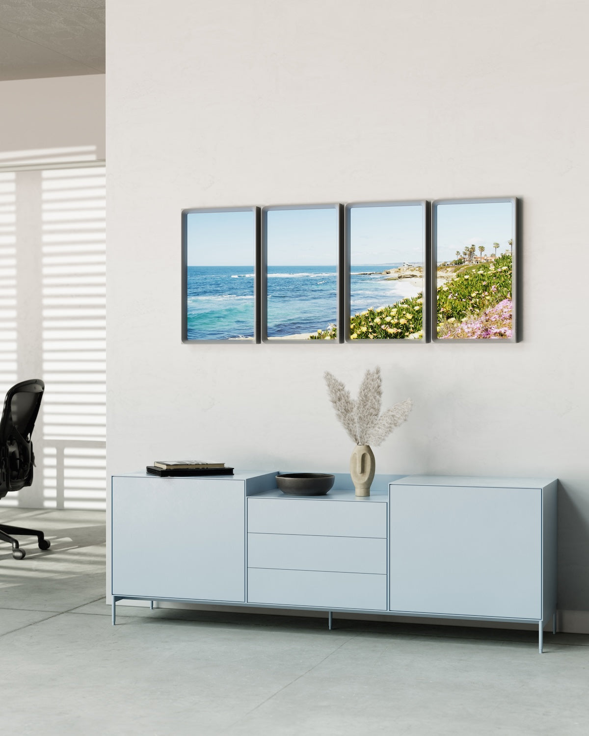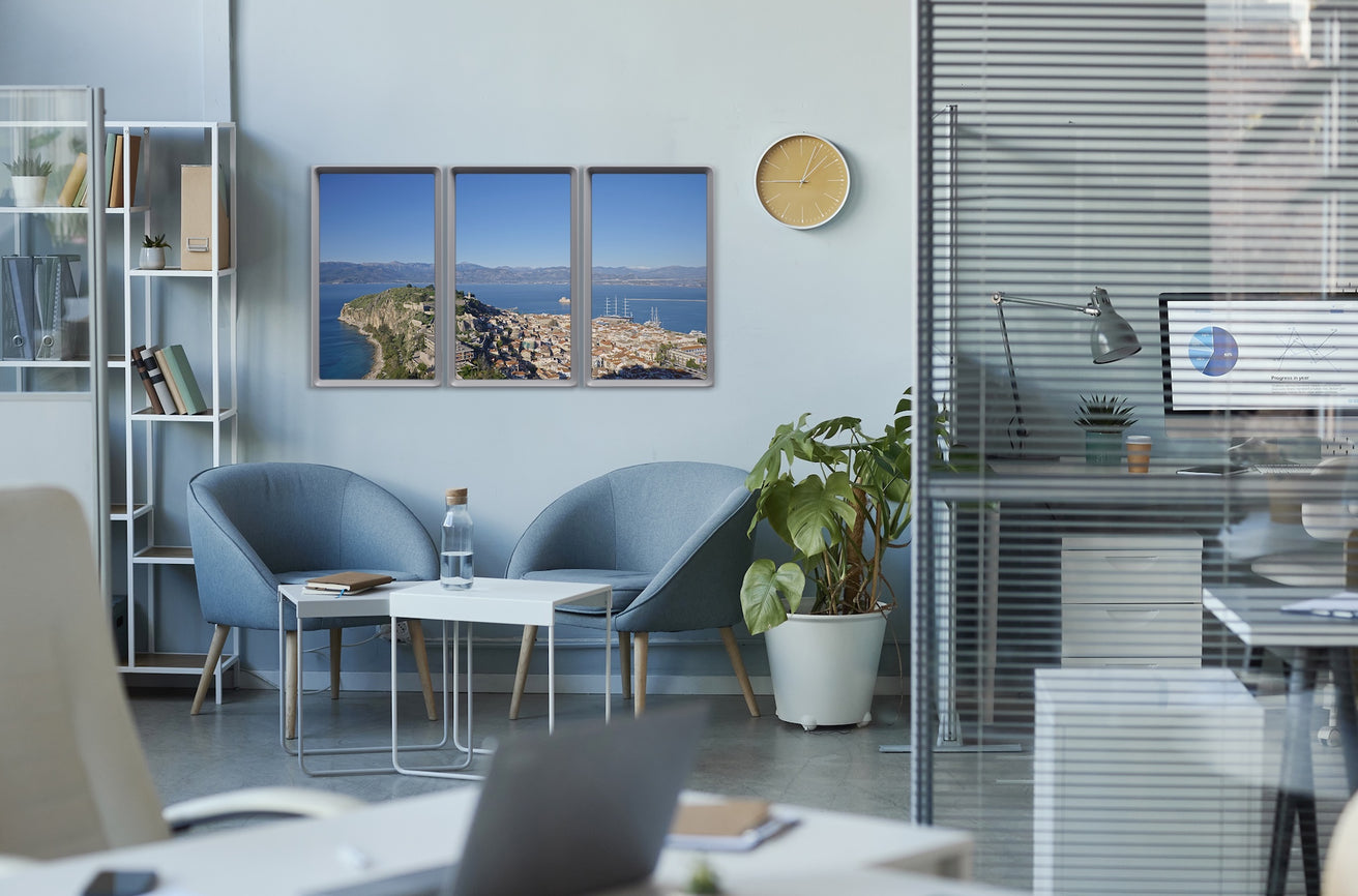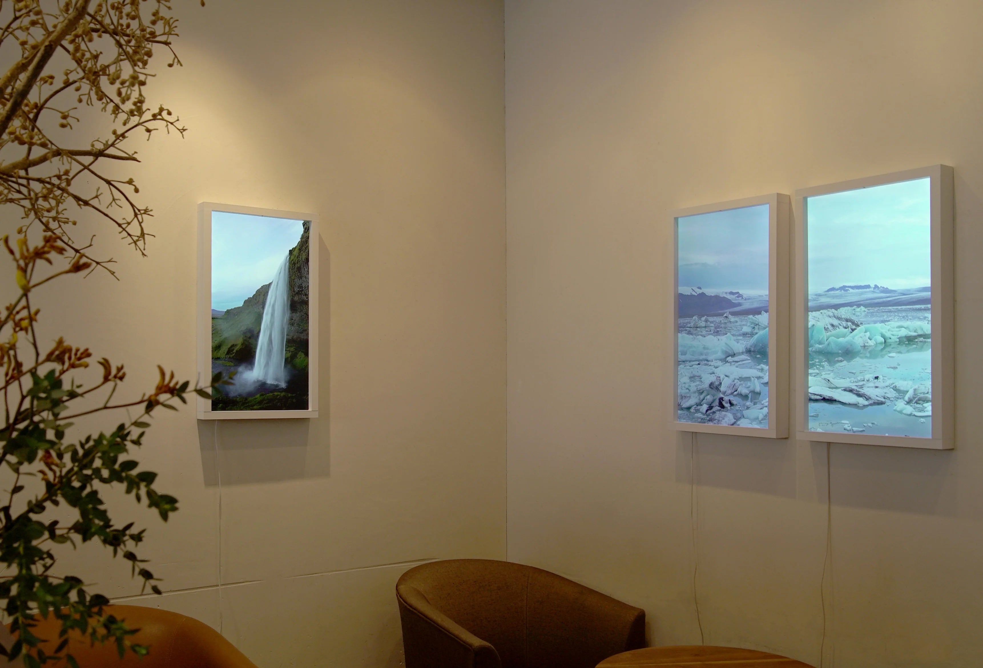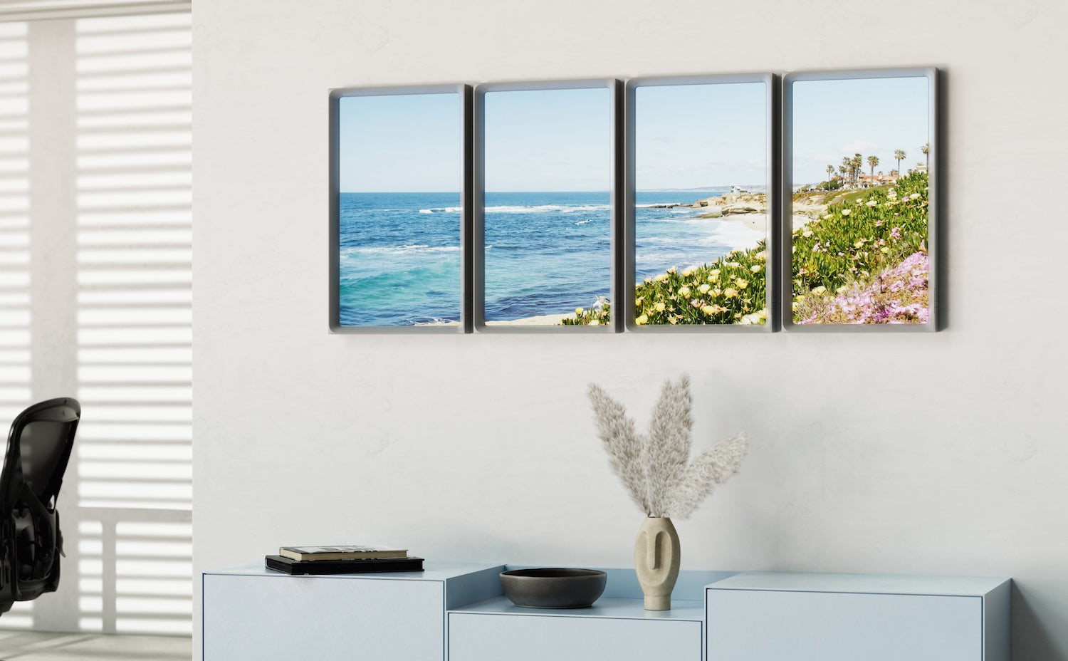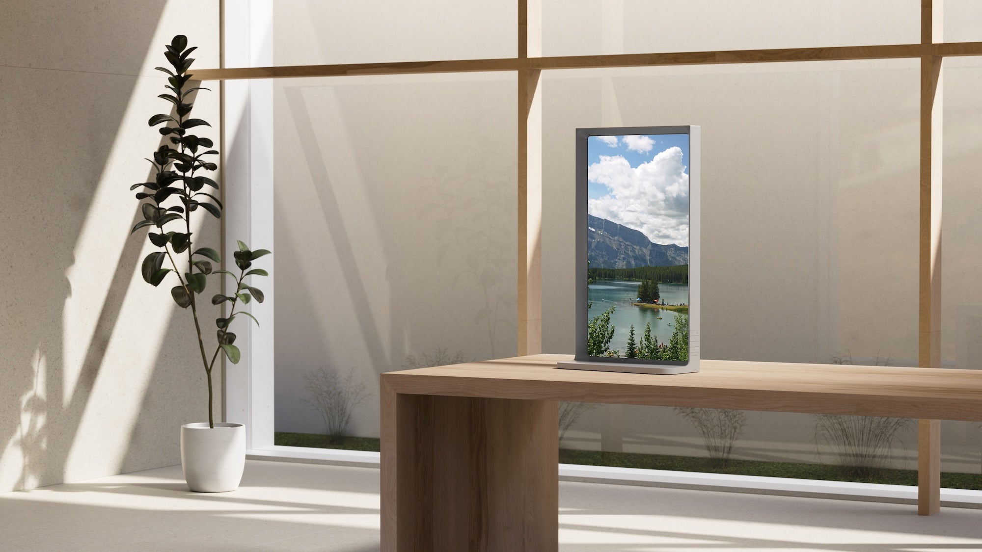 フックやネジなどを取り付け可能な壁と電源さえあれば、容易に設置可能です。大掛かりな施工は不要。壁以外のスペースを必要としないため狭い空間でも設置でき、簡単に窓の風景を変えることができます。またCharging Sillモジュールを使えば、デスクの上にスタンドとして置くこともできます。