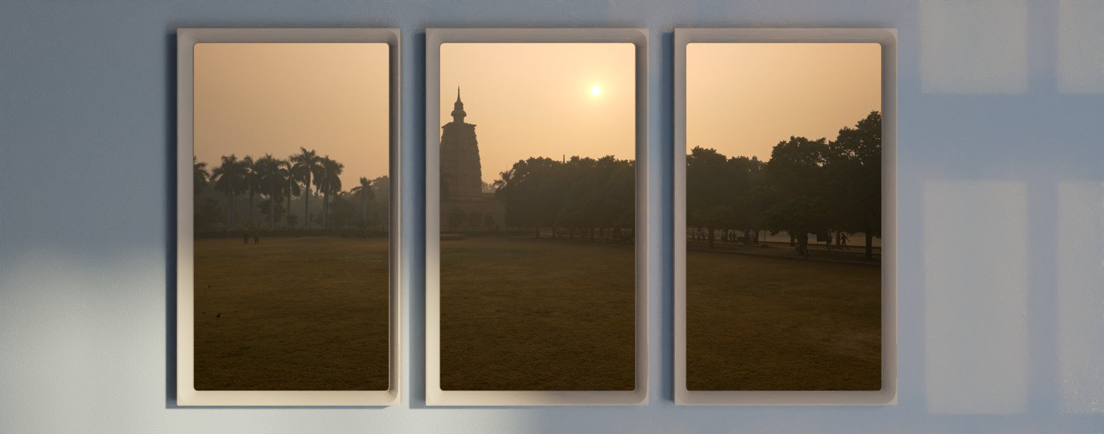 In the soft morning light, the hazy sky takes on a gentle golden glow, silhouetting the temple and the surrounding trees in the park. It’s a serene and slightly mystical scene—one that perfectly reflects the timeless spirit of this sacred Buddhist site. Enjoy this peaceful moment at dawn.